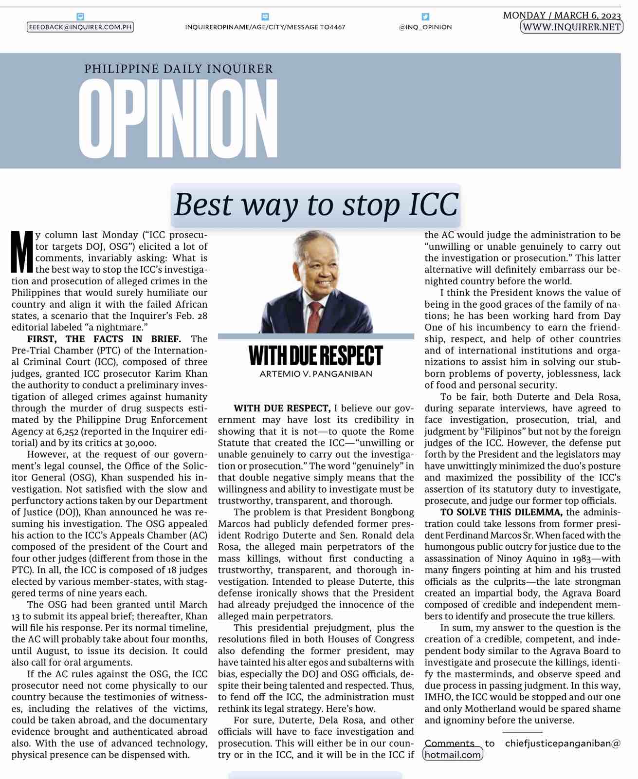 Best way to stop ICC Foundation for Liberty & Prosperity 3 years ago Philippine Daily Inquirer March 6, 2023 (Monday) With Due Respect by Chief Justice ARTEMIO V. PANGANIBAN (Ret.)