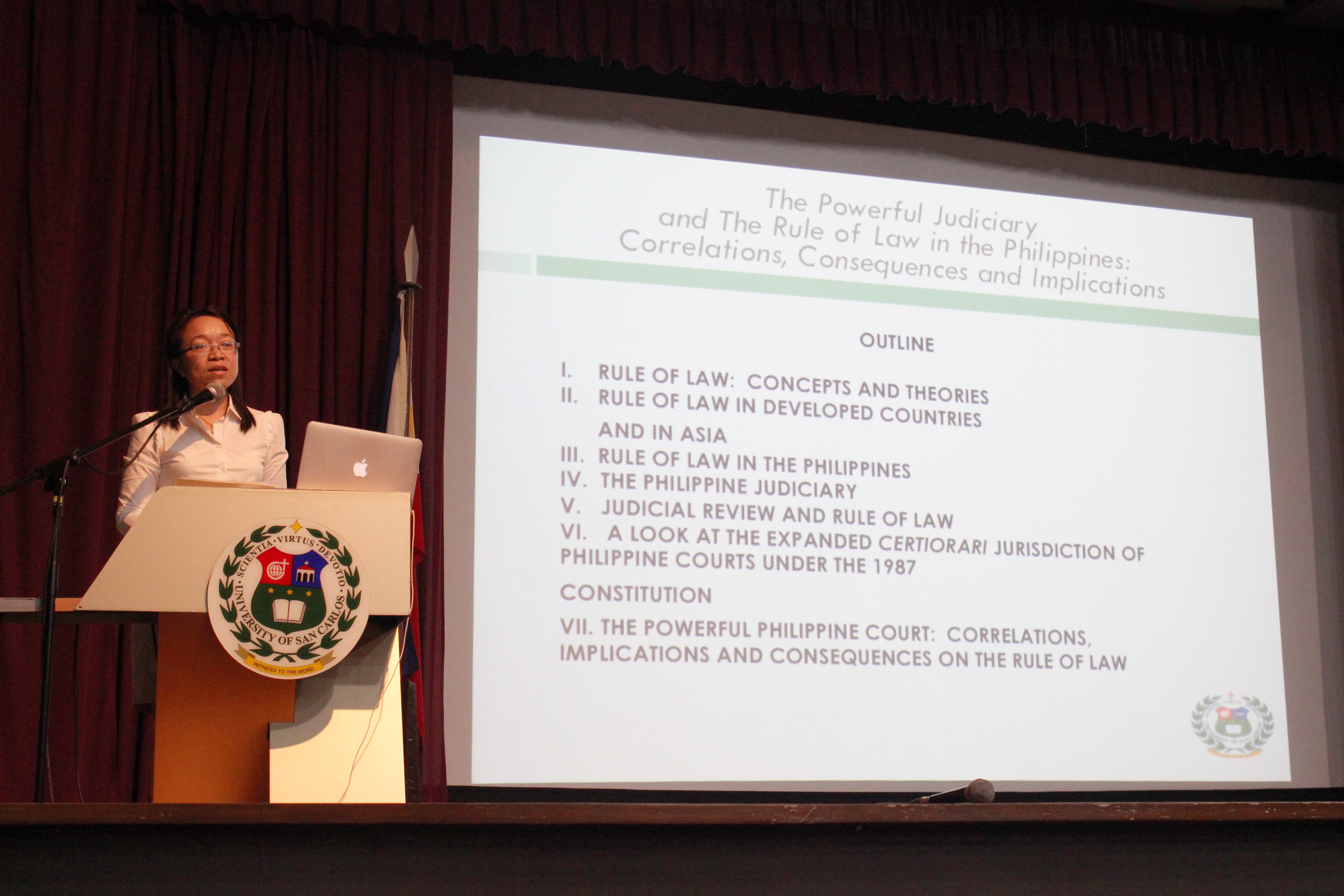 Dean Joan Sarausos-Largo of the University of San Carlos, Cebu School of Law and Governance is the youngest and only lady recipient of the Chief Justice Artemio Panganiban Professorial Chair on Liberty and Prosperity. On 6 March 2013, she delivered her first lecture to a big audience composed of students, faculty, legal minds, and businessmen of Cebu at the Albert van Gansewinkel Hall, in fulfillment of her commitment to conduct original research that may help promote the judicial philosophy of Liberty and Prosperity under the Rule of Law.