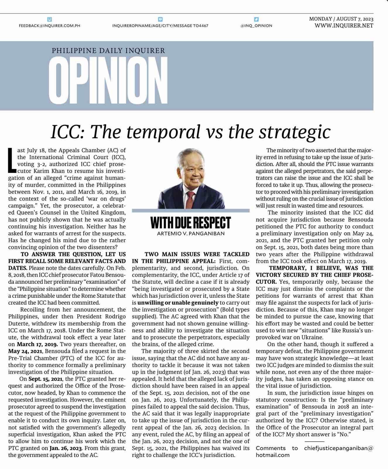 ICC: The temporal vs the strategic Foundation for Liberty & Prosperity 3 years ago Philippine Daily Inquirer August 7, 2023 (Monday) With Due Respect by Chief Justice ARTEMIO V. PANGANIBAN (Ret.)